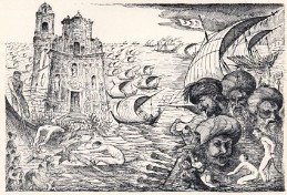 Un disegno di Dino Durante, tratto dal libro: Pescatori di corallo. Turco barbareschi. Banditi e schiavi, Imperia 1984.
